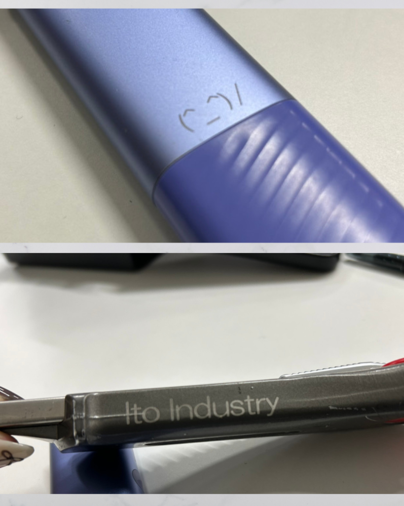 現在は試作段階として、工具類やアイコスなどを用いて刻印テストを行っております。細部の再現性や仕上がりの質感など、さまざまな条件を確認しながら最適な加工方法を探っているところです。